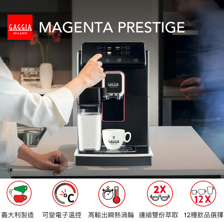 全機於義大利製造,將現代感與尊榮風範融合於咖啡機中。配備全觸控操作面板及高溫奶泡系統,讓您輕鬆ONE TOUCH即可享受香醇的義式濃縮咖啡、美式咖啡、卡布奇諾、拿鐵瑪奇朵、拿鐵和熱牛奶。奢華的氣勢,呈現義大利工藝的極致表現,以尖端科技提供尊爵非凡菁英對咖啡飲品享受的追求。義式咖啡機領航者,GAGGIA咖吉雅